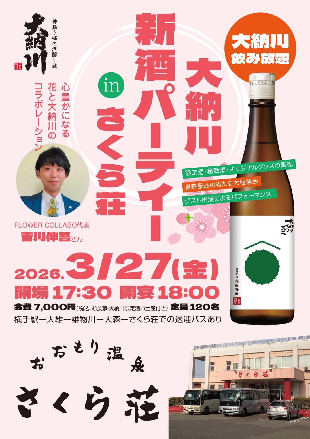 定員120名。早い者勝ちのイベントは新酒を中心とした大納川商品飲み放題!豪華景品の当たる大抽選会!料理長自慢のコース料理!秘蔵酒、グッズの販売!などなど内容盛りだくさんです。そして今回も久々にフラワーアーチスト吉川さんのパフォーマンスも開催の運びとなりました。横手駅からの送迎バスもありますので、是非是非お早目のお申し込みをよろしくお願い申し上げます。